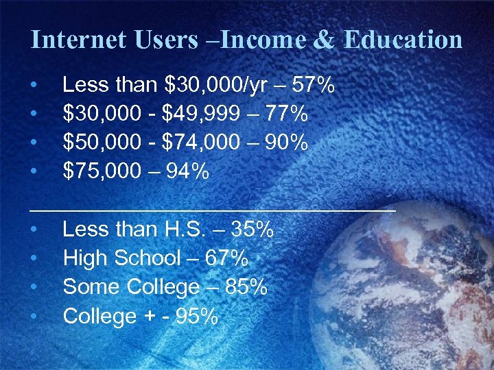 Internet Users –Income & Education • Less than $30, 000/yr – 57% • $30, 000 - $49, 999 – 77% • $50, 000 - $74, 000 – 90% • $75, 000 – 94% _______________ • Less than H. S. – 35% • High School – 67% • Some College – 85% • College + - 95%