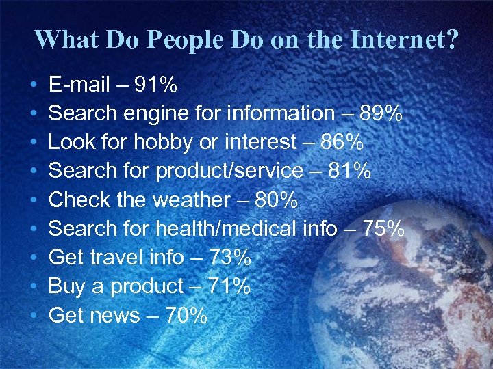 What Do People Do on the Internet? • • • E-mail – 91% Search engine for information – 89% Look for hobby or interest – 86% Search for product/service – 81% Check the weather – 80% Search for health/medical info – 75% Get travel info – 73% Buy a product – 71% Get news – 70%