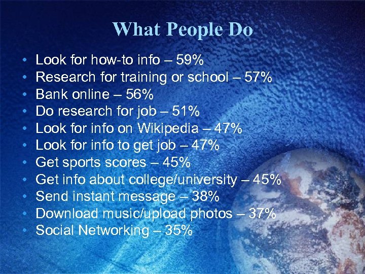 What People Do • • • Look for how-to info – 59% Research for training or school – 57% Bank online – 56% Do research for job – 51% Look for info on Wikipedia – 47% Look for info to get job – 47% Get sports scores – 45% Get info about college/university – 45% Send instant message – 38% Download music/upload photos – 37% Social Networking – 35%