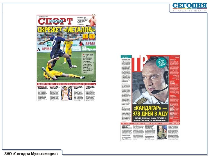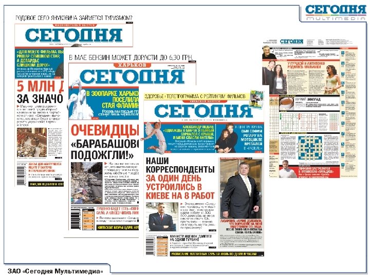 Газета «СЕГОДНЯ» / The Newspaper • • • ЧАО «Сегодня Мультимедиа» владеет следующими активами: • Газета «СЕГОДНЯ» • Портал Segodnya. ua • Типография • Газета «РИО» • Большинство ООО «Редакция газеты «Донецкие новости» , ЧАО «Газета «Приазовский рабочий» и ЧАО «Газета «Вечерний Донецк» Совокупный ежедневный тираж киевского, одесского, харьковского, донецкого, днепропетровского, крымского и национального выпусков составляет примерно 100 000 экземпляров. Газета «СЕГОДНЯ» самое популярное ежедневное издание в г. Киеве The Company owns the following assets: • Newspaper SEGODNYA • Portal Segodnya. ua • Printing Plant • Newspaper RIO • Majority of assets in Donetskie Novosti LLC, Priazovsky Rabochiy Pr. JSC, Vecherny Donetsk Pr. JSC Daily cumulative circulation of Kyiv, Odessa, Kharkiv, Donetsk, Dnepropetrovsk, Crimean and national editions is about 100 000 copies SEGODNYA is the most popular newspaper in Kyiv, and according to TNS Ukraine latest data has the largest readership in the capital