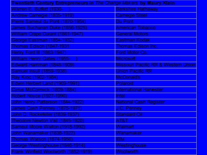 Maury Klein on the Childhoods of Entrepreneurs • Middle class or wealthy families • Many fathers had career problems or marital problems • A few had especially devoted or attentive mothers • “Education offers little that explains their success except perhaps in a negative role” • Started work early and worked very hard • Often inspired by mentors