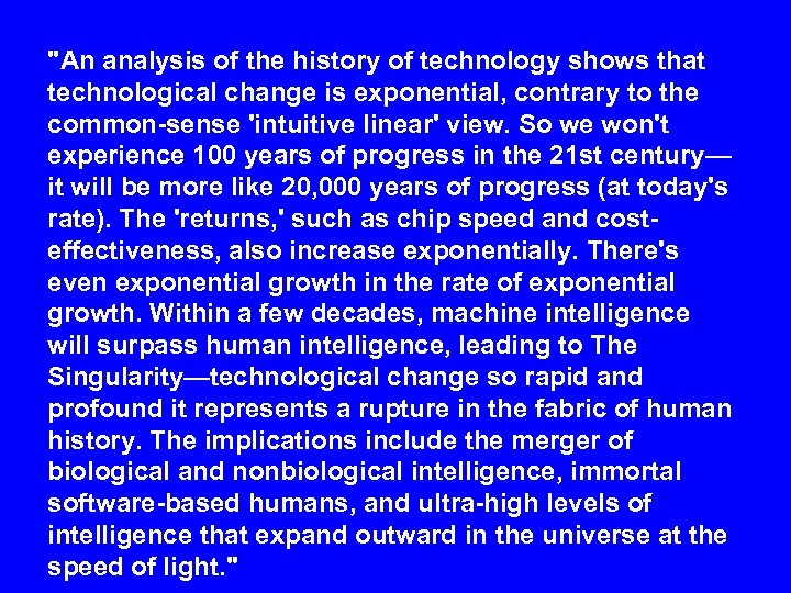 "An analysis of the history of technology shows that technological change is exponential, contrary to the common-sense 'intuitive linear' view. So we won't experience 100 years of progress in the 21 st century— it will be more like 20, 000 years of progress (at today's rate). The 'returns, ' such as chip speed and costeffectiveness, also increase exponentially. There's even exponential growth in the rate of exponential growth. Within a few decades, machine intelligence will surpass human intelligence, leading to The Singularity—technological change so rapid and profound it represents a rupture in the fabric of human history. The implications include the merger of biological and nonbiological intelligence, immortal software-based humans, and ultra-high levels of intelligence that expand outward in the universe at the speed of light. "