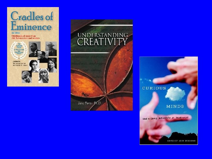 Samples in the Cradles of Eminence Research • 1962: Over 400 people with biographies in the Montclair, NJ public library • 1978: Follow-up sample of over 300 from the Menlo Park, CA pubic library • 2003: Sample of over 700 from the Montclair public library online catalog, supplemented expert judgments from Time and Life magazine studies