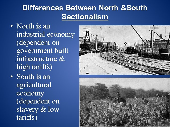 Differences Between North &South Sectionalism • North is an industrial economy (dependent on government built infrastructure & high tariffs) • South is an agricultural economy (dependent on slavery & low tariffs)
