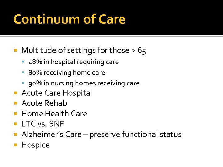 Continuum of Care Multitude of settings for those > 65 48% in hospital requiring care 80% receiving home care 90% in nursing homes receiving care Acute Care Hospital Acute Rehab Home Health Care LTC vs. SNF Alzheimer’s Care – preserve functional status Hospice