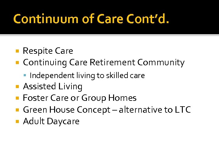 Continuum of Care Cont’d. Respite Care Continuing Care Retirement Community Independent living to skilled care Assisted Living Foster Care or Group Homes Green House Concept – alternative to LTC Adult Daycare