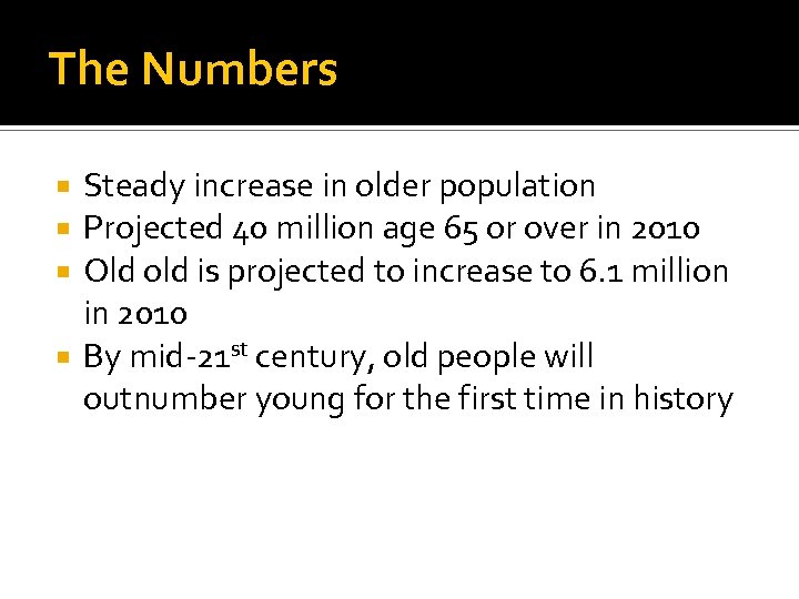 The Numbers Steady increase in older population Projected 40 million age 65 or over in 2010 Old old is projected to increase to 6. 1 million in 2010 By mid-21 st century, old people will outnumber young for the first time in history