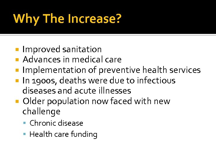 Why The Increase? Improved sanitation Advances in medical care Implementation of preventive health services In 1900 s, deaths were due to infectious diseases and acute illnesses Older population now faced with new challenge Chronic disease Health care funding