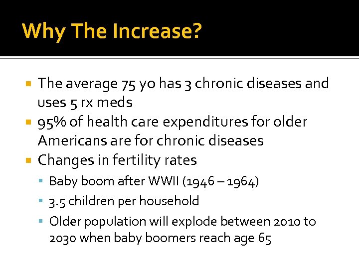 Why The Increase? The average 75 yo has 3 chronic diseases and uses 5 rx meds 95% of health care expenditures for older Americans are for chronic diseases Changes in fertility rates Baby boom after WWII (1946 – 1964) 3. 5 children per household Older population will explode between 2010 to 2030 when baby boomers reach age 65