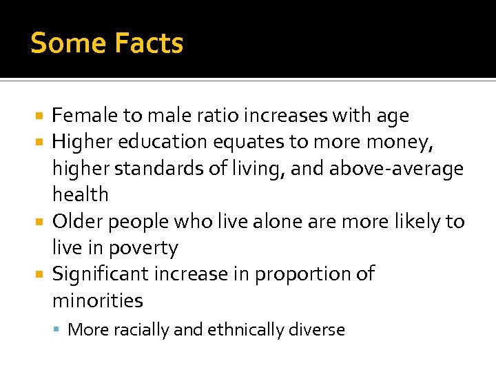 Some Facts Female to male ratio increases with age Higher education equates to more money, higher standards of living, and above-average health Older people who live alone are more likely to live in poverty Significant increase in proportion of minorities More racially and ethnically diverse