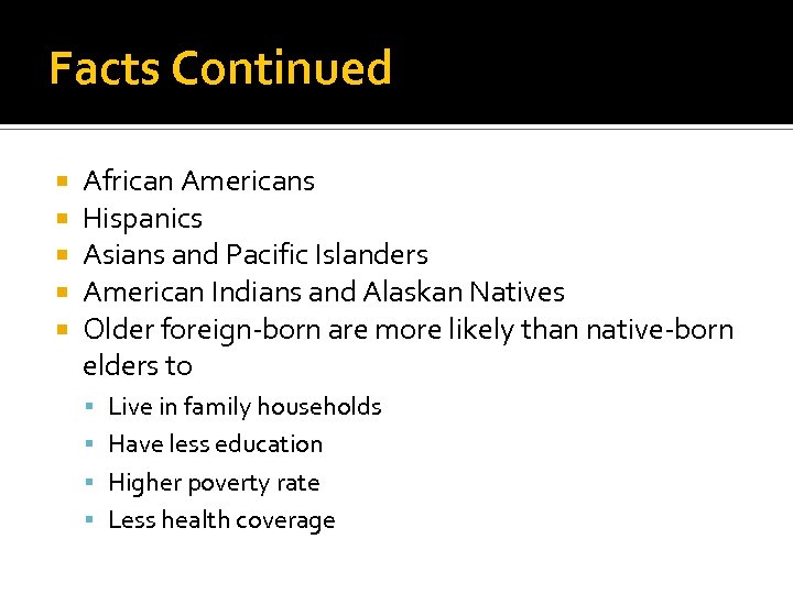 Facts Continued African Americans Hispanics Asians and Pacific Islanders American Indians and Alaskan Natives Older foreign-born are more likely than native-born elders to Live in family households Have less education Higher poverty rate Less health coverage