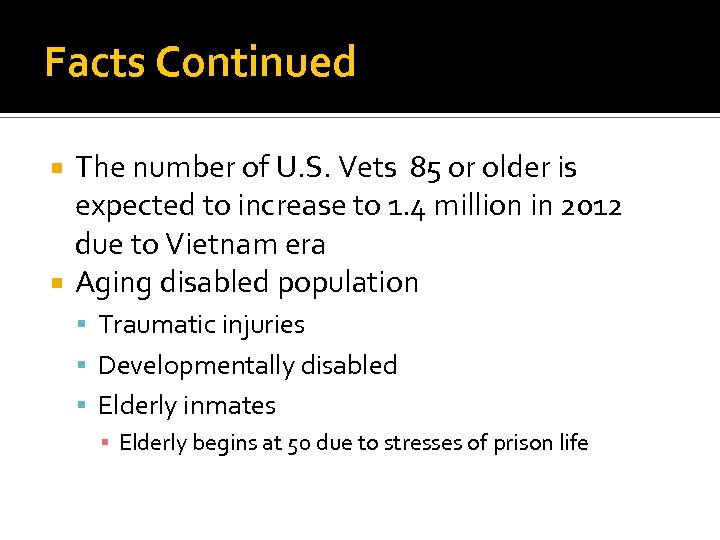 Facts Continued The number of U. S. Vets 85 or older is expected to increase to 1. 4 million in 2012 due to Vietnam era Aging disabled population Traumatic injuries Developmentally disabled Elderly inmates ▪ Elderly begins at 50 due to stresses of prison life