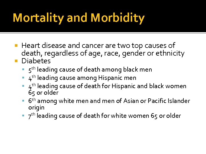 Mortality and Morbidity Heart disease and cancer are two top causes of death, regardless of age, race, gender or ethnicity Diabetes 5 th leading cause of death among black men 4 th leading cause among Hispanic men 4 th leading cause of death for Hispanic and black women 65 or older 6 th among white men and men of Asian or Pacific Islander origin 7 th leading cause of death for white women 65 or older