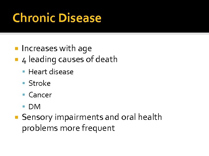 Chronic Disease Increases with age 4 leading causes of death Heart disease Stroke Cancer DM Sensory impairments and oral health problems more frequent
