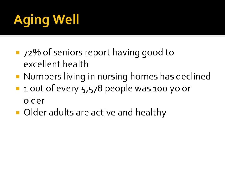 Aging Well 72% of seniors report having good to excellent health Numbers living in nursing homes has declined 1 out of every 5, 578 people was 100 yo or older Older adults are active and healthy