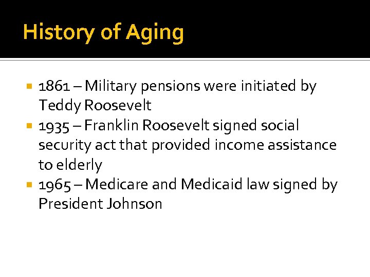 History of Aging 1861 – Military pensions were initiated by Teddy Roosevelt 1935 – Franklin Roosevelt signed social security act that provided income assistance to elderly 1965 – Medicare and Medicaid law signed by President Johnson