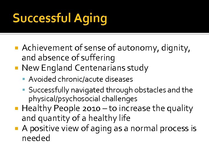 Successful Aging Achievement of sense of autonomy, dignity, and absence of suffering New England Centenarians study Avoided chronic/acute diseases Successfully navigated through obstacles and the physical/psychosocial challenges Healthy People 2010 – to increase the quality and quantity of a healthy life A positive view of aging as a normal process is needed