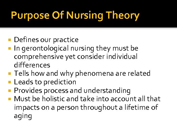 Purpose Of Nursing Theory Defines our practice In gerontological nursing they must be comprehensive yet consider individual differences Tells how and why phenomena are related Leads to prediction Provides process and understanding Must be holistic and take into account all that impacts on a person throughout a lifetime of aging