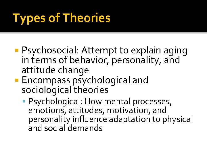 Types of Theories Psychosocial: Attempt to explain aging in terms of behavior, personality, and attitude change Encompass psychological and sociological theories Psychological: How mental processes, emotions, attitudes, motivation, and personality influence adaptation to physical and social demands