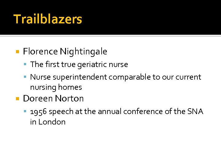 Trailblazers Florence Nightingale The first true geriatric nurse Nurse superintendent comparable to our current nursing homes Doreen Norton 1956 speech at the annual conference of the SNA in London