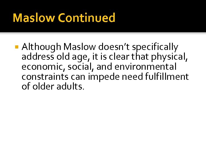 Maslow Continued Although Maslow doesn’t specifically address old age, it is clear that physical, economic, social, and environmental constraints can impede need fulfillment of older adults.