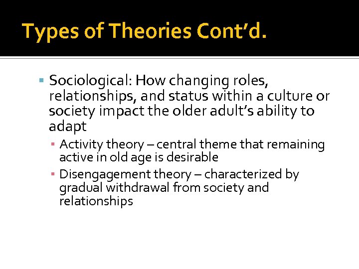 Types of Theories Cont’d. Sociological: How changing roles, relationships, and status within a culture or society impact the older adult’s ability to adapt ▪ Activity theory – central theme that remaining active in old age is desirable ▪ Disengagement theory – characterized by gradual withdrawal from society and relationships