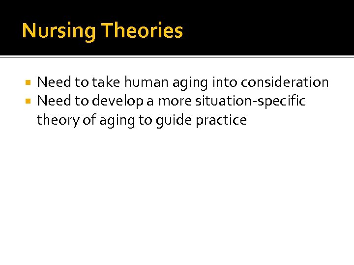 Nursing Theories Need to take human aging into consideration Need to develop a more situation-specific theory of aging to guide practice