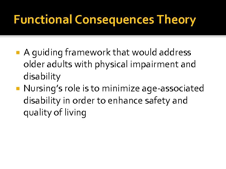 Functional Consequences Theory A guiding framework that would address older adults with physical impairment and disability Nursing’s role is to minimize age-associated disability in order to enhance safety and quality of living