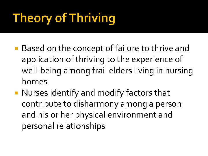 Theory of Thriving Based on the concept of failure to thrive and application of thriving to the experience of well-being among frail elders living in nursing homes Nurses identify and modify factors that contribute to disharmony among a person and his or her physical environment and personal relationships
