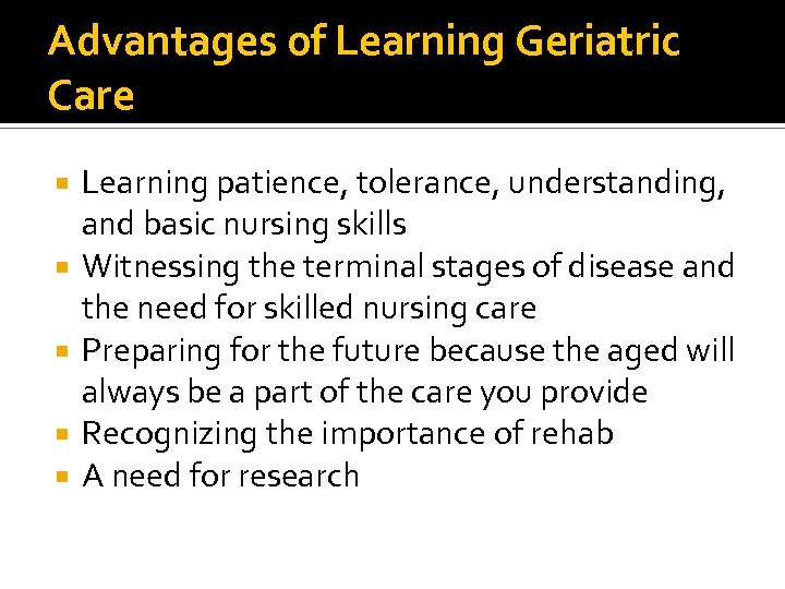 Advantages of Learning Geriatric Care Learning patience, tolerance, understanding, and basic nursing skills Witnessing the terminal stages of disease and the need for skilled nursing care Preparing for the future because the aged will always be a part of the care you provide Recognizing the importance of rehab A need for research