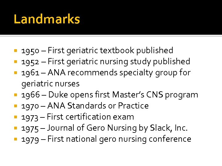 Landmarks 1950 – First geriatric textbook published 1952 – First geriatric nursing study published 1961 – ANA recommends specialty group for geriatric nurses 1966 – Duke opens first Master’s CNS program 1970 – ANA Standards or Practice 1973 – First certification exam 1975 – Journal of Gero Nursing by Slack, Inc. 1979 – First national gero nursing conference