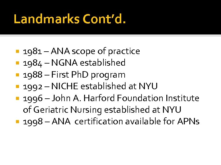 Landmarks Cont’d. 1981 – ANA scope of practice 1984 – NGNA established 1988 – First Ph. D program 1992 – NICHE established at NYU 1996 – John A. Harford Foundation Institute of Geriatric Nursing established at NYU 1998 – ANA certification available for APNs