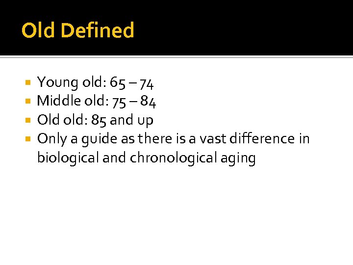 Old Defined Young old: 65 – 74 Middle old: 75 – 84 Old old: 85 and up Only a guide as there is a vast difference in biological and chronological aging