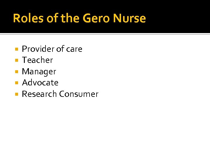 Roles of the Gero Nurse Provider of care Teacher Manager Advocate Research Consumer
