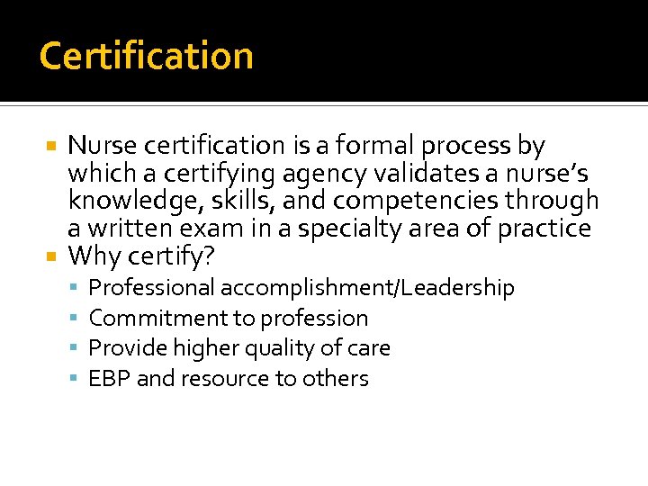 Certification Nurse certification is a formal process by which a certifying agency validates a nurse’s knowledge, skills, and competencies through a written exam in a specialty area of practice Why certify? Professional accomplishment/Leadership Commitment to profession Provide higher quality of care EBP and resource to others