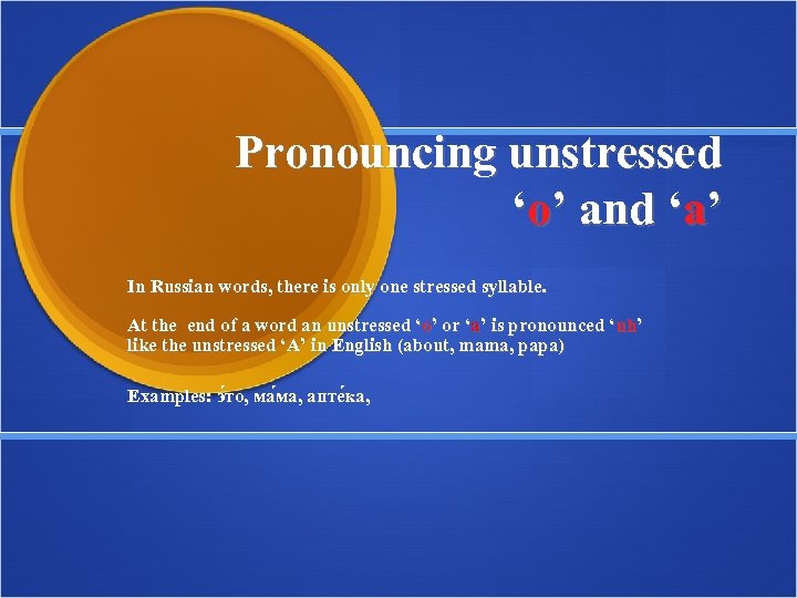 Pronouncing unstressed ‘o’ and ‘a’ In Russian words, there is only one stressed syllable. At the end of a word an unstressed ‘о’ or ‘а’ is pronounced ‘uh’ like the unstressed ‘A’ in English (about, mama, papa) Examples: э то, ма ма, апте ка,