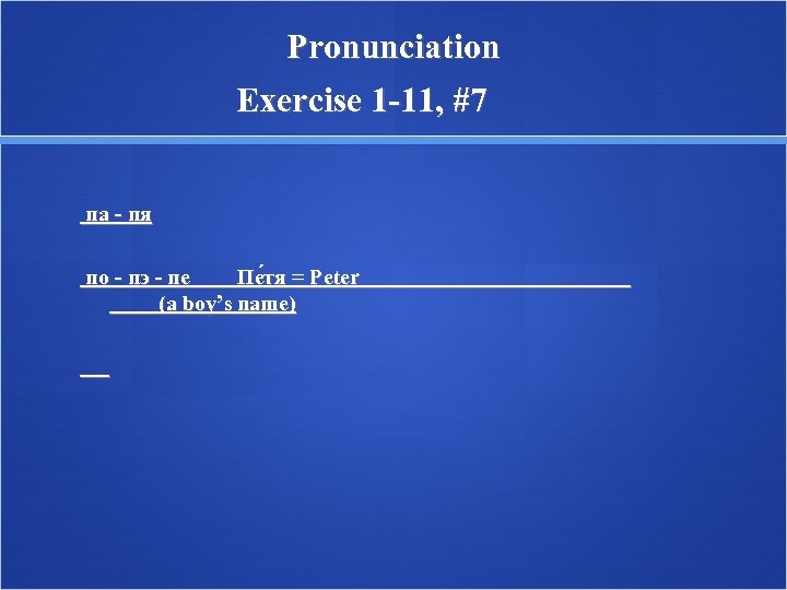 Pronunciation Exercise 1 -11, #7 па - пя по - пэ - пе Пе тя = Peter (a boy’s name)