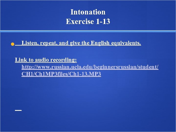 Intonation Exercise 1 -13 Listen, repeat, and give the English equivalents. Link to audio recording: http: //www. russian. ucla. edu/beginnersrussian/student/ CH 1/Ch 1 MP 3 files/Ch 1 -13. MP 3
