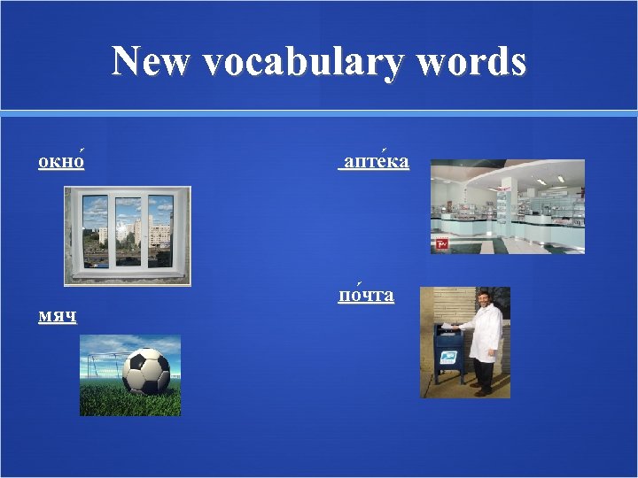 New vocabulary words окно мяч апте ка по чта
