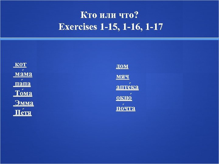 Кто или что? Exercises 1 -15, 1 -16, 1 -17 кот ма ма па па То ма Эмма Пе тя дом мяч апте ка окно по чта