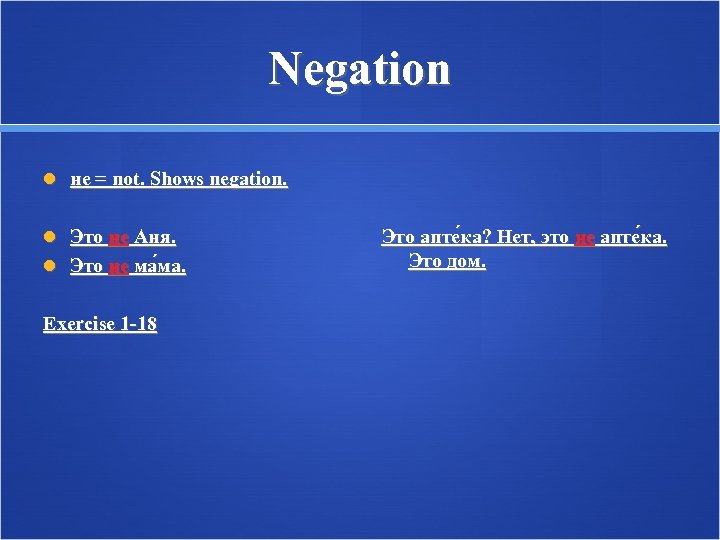 Negation не = not. Shows negation. Это не Аня. Это не ма ма. Exercise 1 -18 Это апте ка? Нет, это не апте ка. Это дом.