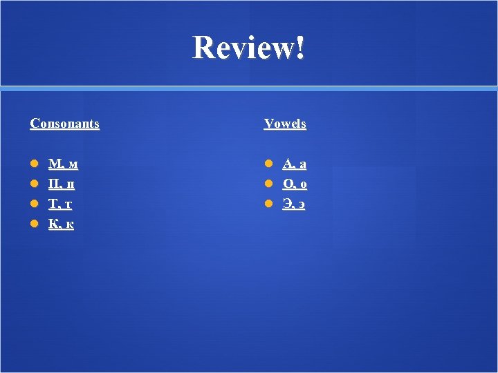 Review! Consonants Vowels М, м А, а П, п O, о Т, т Э, э К, к