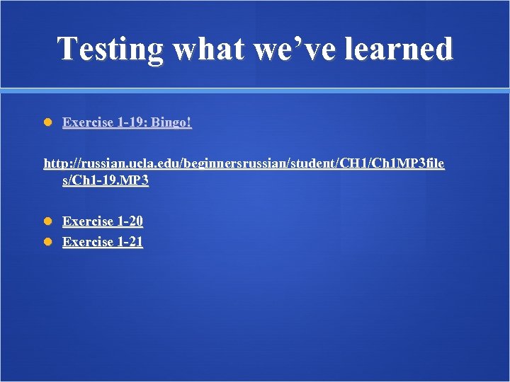 Testing what we’ve learned Exercise 1 -19: Bingo! http: //russian. ucla. edu/beginnersrussian/student/CH 1/Ch 1 MP 3 file s/Ch 1 -19. MP 3 Exercise 1 -20 Exercise 1 -21