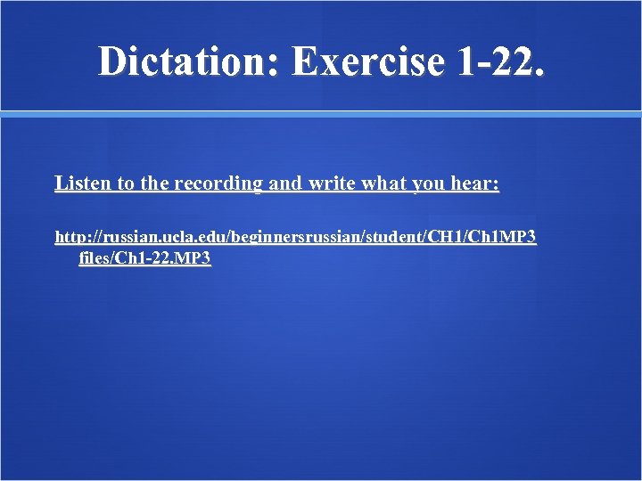 Dictation: Exercise 1 -22. Listen to the recording and write what you hear: http: //russian. ucla. edu/beginnersrussian/student/CH 1/Ch 1 MP 3 files/Ch 1 -22. MP 3
