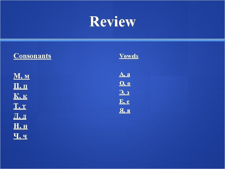 Review Consonants Vowels М, м П, п К, к Т, т Д, д Н, н Ч, ч А, а О, о Э, э Е, е Я, я