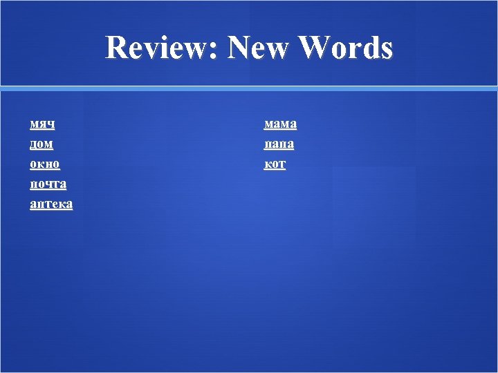 Review: New Words мяч дом окно почта аптека мама папа кот