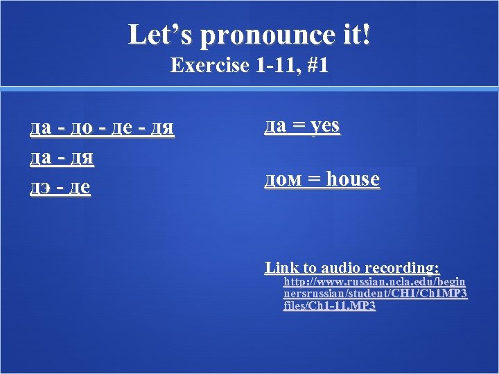 Let’s pronounce it! Exercise 1 -11, #1 да - до - де - дя да - дя дэ - де да = yes дом = house Link to audio recording: http: //www. russian. ucla. edu/begin nersrussian/student/CH 1/Ch 1 MP 3 files/Ch 1 -11. MP 3
