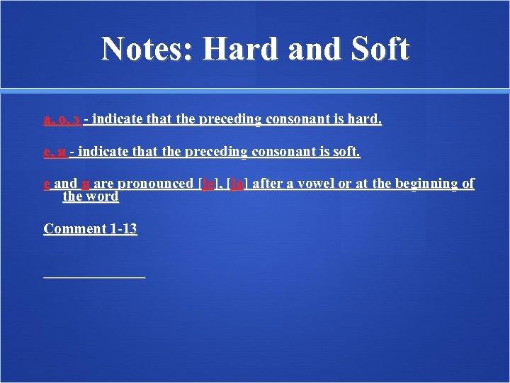 Notes: Hard and Soft а, о, э - indicate that the preceding consonant is hard. е, я - indicate that the preceding consonant is soft. е and я are pronounced [je], [ja] after a vowel or at the beginning of the word Comment 1 -13