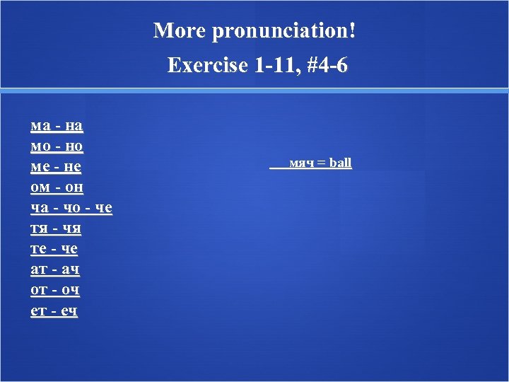 More pronunciation! Exercise 1 -11, #4 -6 ма - на мо - но ме - не ом - он ча - чо - че тя - чя те - че ат - ач от - оч ет - еч мяч = ball