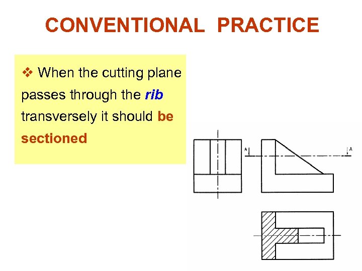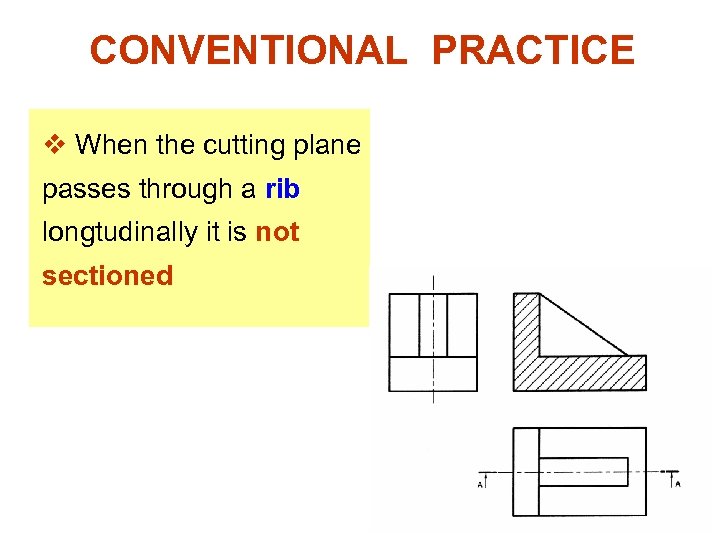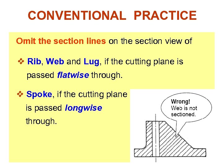 CONVENTIONAL PRACTICE Omit the section lines on the section view of v Rib, Web and Lug, if the cutting plane is passed flatwise through. v Spoke, if the cutting plane is passed longwise through.